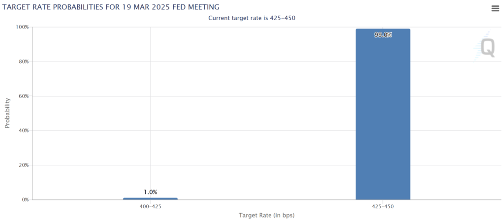 طبق ابزار فدواچ گروه CME، احتمال ۹۹٪ وجود دارد که نرخ بهره کنونی بین ۴.۲۵٪ تا ۴.۵۰٪ باقی بماند و تنها ۱٪ احتمال کاهش ۰.۲۵٪ آن وجود دارد.