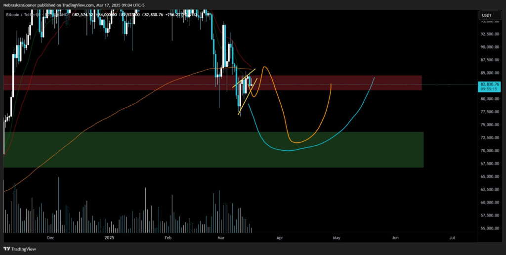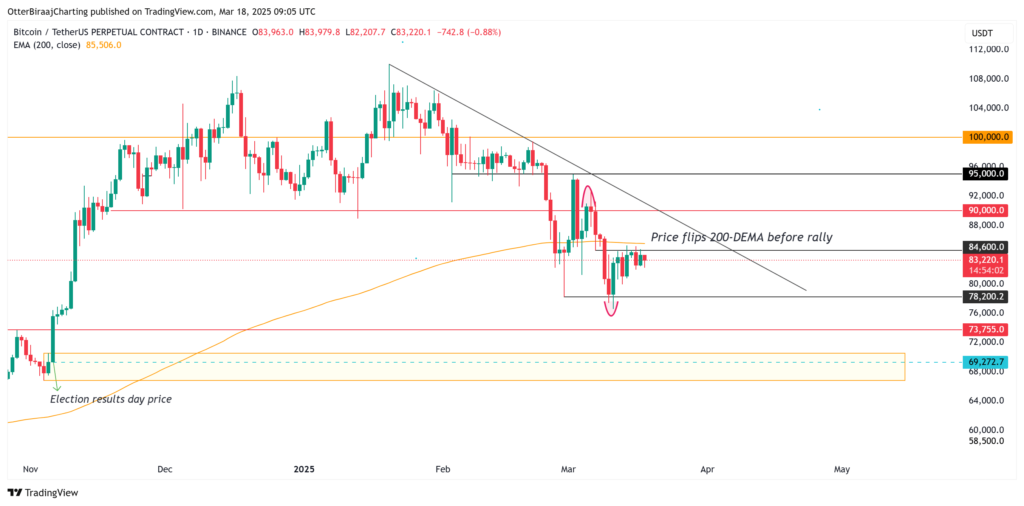 بیت کوین باید سطح مقاومت ۸۵٬۰۰۰ دلاری را به حمایت تبدیل کند تا بتواند اهداف بالاتر مانند ۹۰٬۰۰۰ دلار را هدف قرار دهد. برای این منظور، ابتدا لازم است که BTC/USD جایگاه خود را بالای میانگین متحرک نمایی ۲۰۰ روزه (خط نارنجی) در نمودار روزانه بازیابی کند.