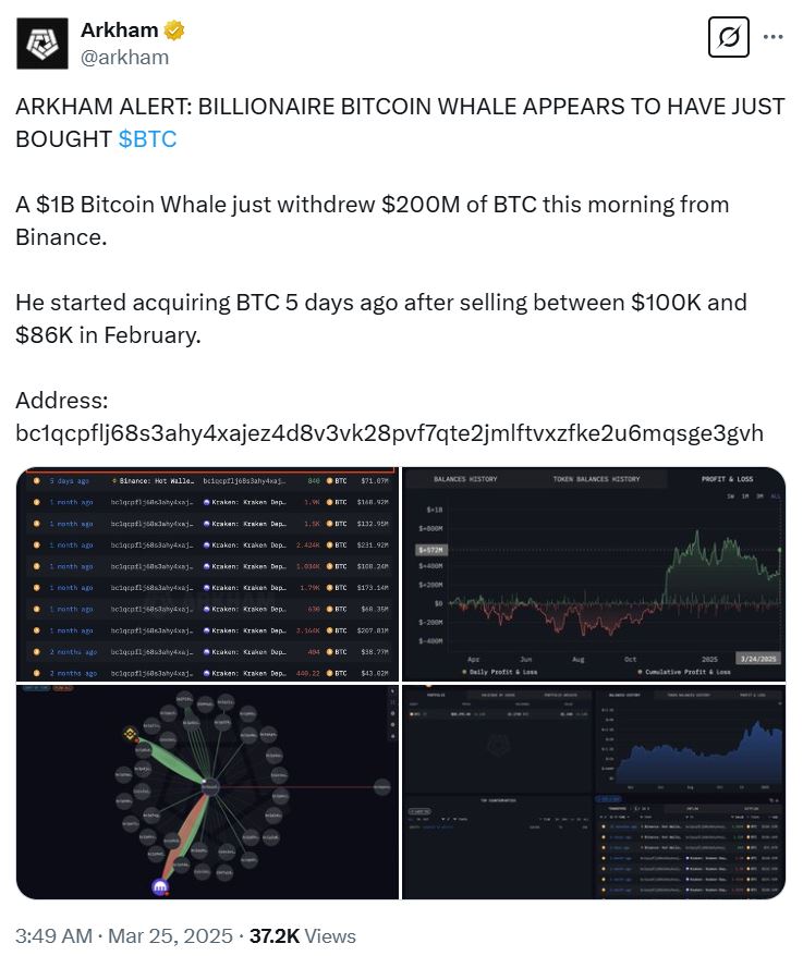 این نهنگ از پنج روز پیش، پس از فروش بخشی از داراییهای خود در زمانی که قیمت بیت کوین بین ۱۰۰ هزار تا ۸۶,۰۰۰ دلار در ماه فوریه نوسان داشت، شروع به خرید مجدد این ارز دیجیتال کرده است.