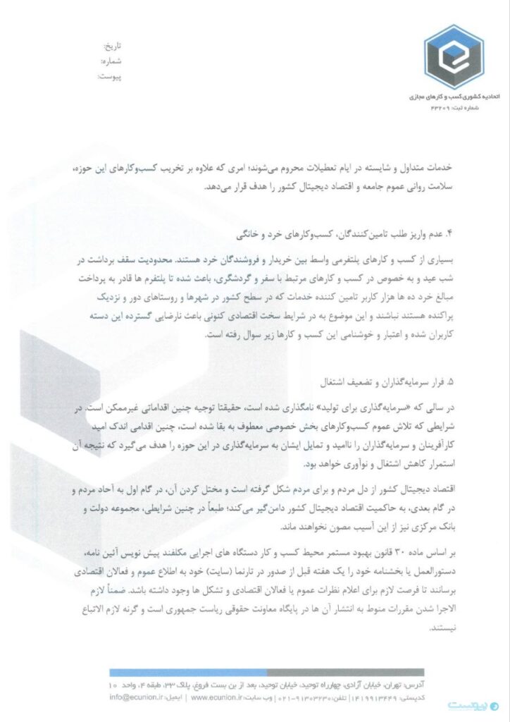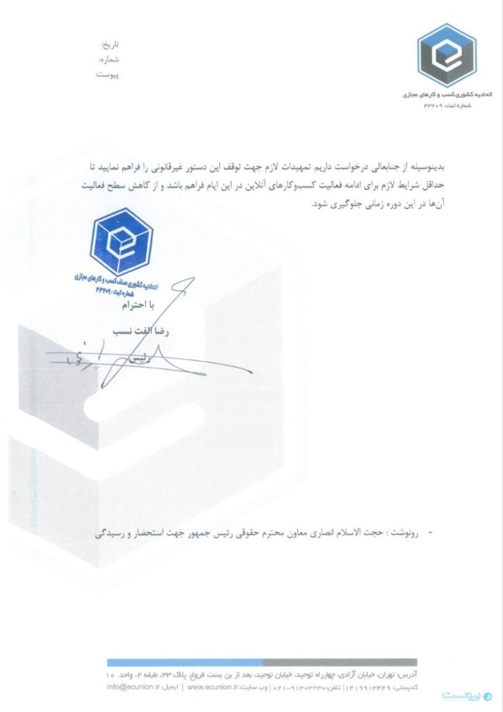 در پایان این نامه، اتحادیه کسبوکارهای مجازی خواستار لغو سریع این تصمیم شده و از رئیس قوه قضاییه درخواست کرده است که از اجرای این محدودیت جلوگیری شود تا کسبوکارهای آنلاین بتوانند بدون اختلال به فعالیت خود ادامه دهند.