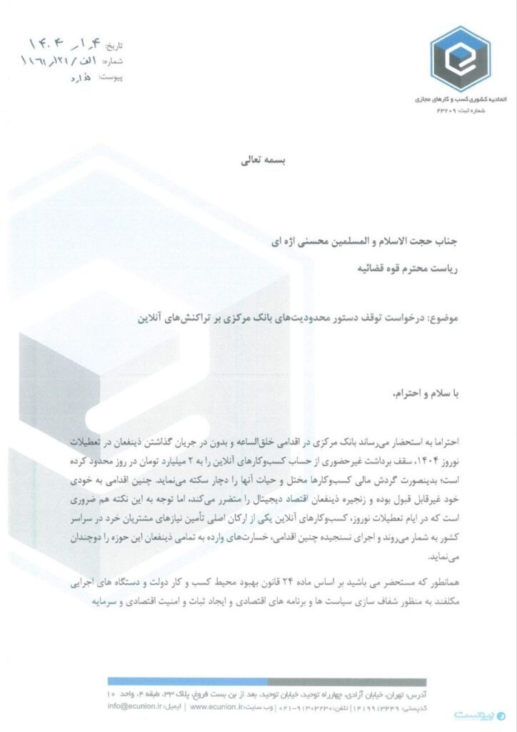 اتحادیه کسبوکارهای مجازی در نامهای به رئیس قوه قضاییه، نگرانی خود را از تصمیم اخیر بانک مرکزی درباره کاهش سقف برداشت غیرحضوری از حسابهای کسبوکارهای آنلاین اعلام کرد و خواستار بازنگری در این سیاست شد.