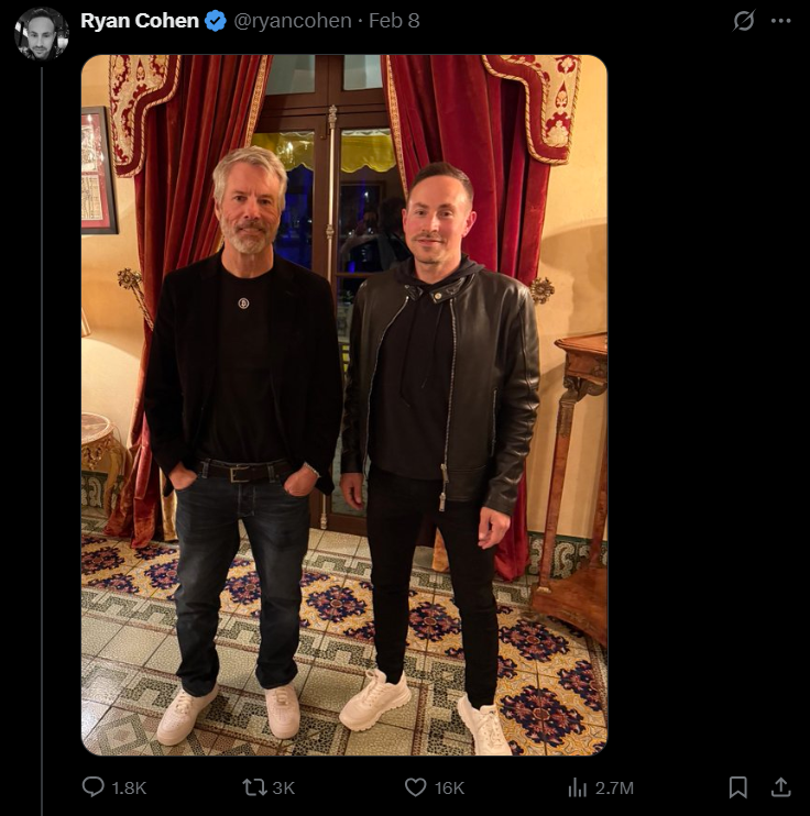 شایعات مربوط به سرمایهگذاری گیماستاپ در بیت کوین از ماه فوریه آغاز شد و همین گمانهزنیها قیمت سهام GME را افزایش داد. اوایل همین ماه نیز رایان کوهن (Ryan Cohen)، مدیرعامل گیماستاپ، تصویری بدون هیچگونه توضیحی کنار مایکل سیلر (Michael Saylor)، بنیانگذار شرکت استراتژی (Strategy) که یکی از سرسختترین طرفداران بیت کوین است منتشر کرد. این پست در نهایت هیجان زیادی بین کاربران گیماستاپ نسبت به سرمایهگذاری احتمالی آنها در بیت کوین ایجاد کرد.