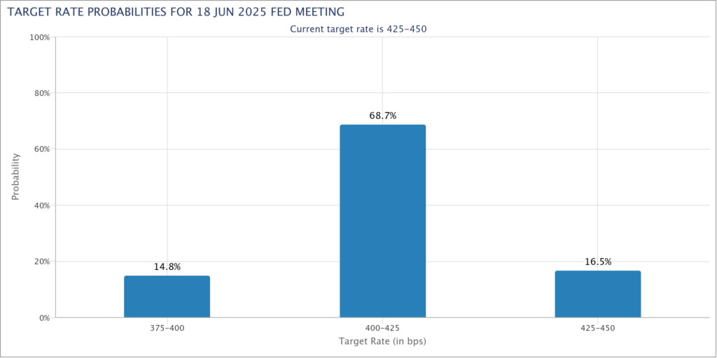 بر اساس دادههای فد واچ (CME Group’s FedWatch)، همچنان احتمال بالایی وجود دارد که فدرال رزرو در جلسه ژوئن نرخ بهره را کاهش دهد.