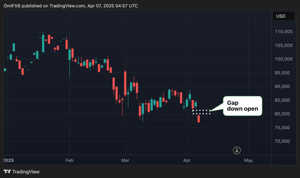 قراردادهای آتی که سررسید آنها در آخرین جمعه ماه آوریل است، معاملات خود را با قیمت ۷۹٬۵۹۰ دلار آغاز کرد. این رقم ۵.۶٪ کمتر از قیمت پایانی روز جمعه (۸۴٬۲۵۰ دلار) بود و قیمت بیت کوین به سرعت تا ۷۶٬۸۰۰ دلار نیز کاهش یافت.
