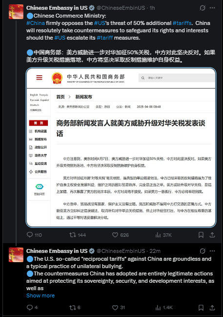 در توییت بعدی، سفارت چین تأکید کرد که اقداماتی که پکن تا کنون در پاسخ به تعرفههای قبلی اتخاذ کرده، کاملاً مشروع و در راستای دفاع از حاکمیت، امنیت، و منافع توسعهای کشور بوده است.