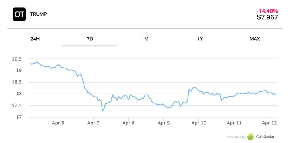 قیمت ترامپ در زمان نگارش مطلب حدوداً ۸.۰۳ دلار است؛ یعنی از ۱۸ ژانویه (دو روز پیش از مراسم تحلیف ترامپ) تاکنون با ۸۳٪ کاهش مواجه شده است.