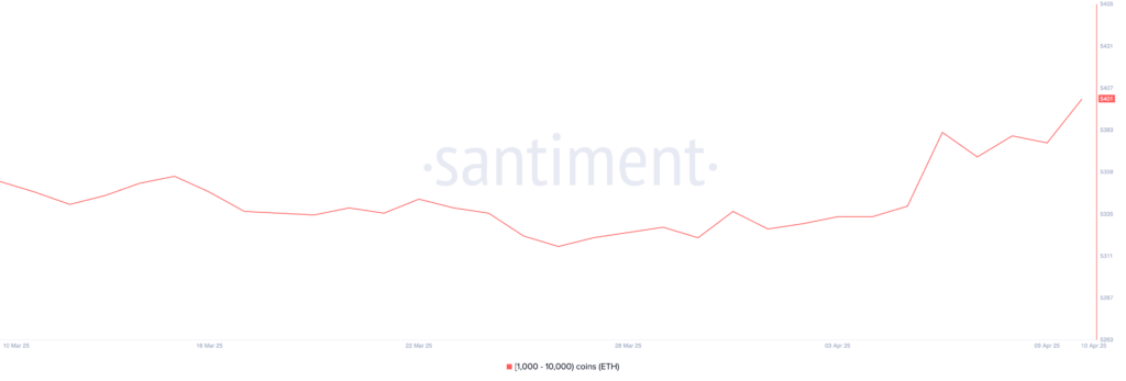 تعداد آدرسهایی که بین ۱,۰۰۰ تا ۱۰,۰۰۰ آلت کوین ETH در اختیار دارند – منبع: Santiment