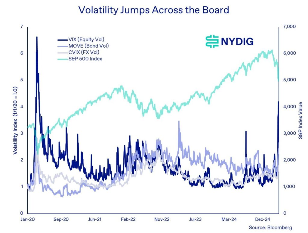 پس از اعلام تعرفههای ترامپ، نرخ نوسانات سهام، اوراق قرضه و ارزهای خارجی افزایش یافت. منبع: NYDIG