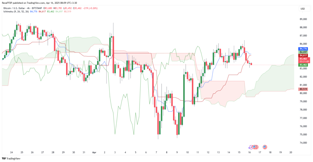 در نمودار چهار ساعته بیت کوین، قیمت در حال حاضر در محدوده ۸۳٬۴۶۲ دلار قرار دارد و پس از برخورد به مقاومتهای موجود در حوالی خط تنکانسن (آبی) و کیجونسن (قرمز)، با فشار فروش مواجه شده است. تنکانسن در محدوده ۸۴٬۷۷۶ دلار و کیجونسن در ۸۴٬۶۹۷ دلار قرار دارند و این نزدیکی نشاندهنده فاز تعادلی بازار در بازه کوتاهمدت است. قیمت در حال حاضر زیر هر دو خط مذکور قرار گرفته که سیگنالی منفی تلقی میشود.
