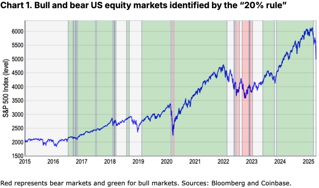 ما در گذشته دیدهایم که کاهشهای ناشی از احساسات بازار، حتی اگر به آستانه قراردادی ۲۰٪ نرسند، میتوانند منجر به ستاپ دفاعی پورتفولیو شوند. به عبارت دیگر، ما معتقدیم که بازارهای نزولی اساساً نشاندهنده تغییرات بنیادین در ساختار بازار هستند که با تضعیف عوامل فاندامنتال و کاهش نقدینگی مشخص میشوند، نه صرفاً کاهشهای درصدی آنها.