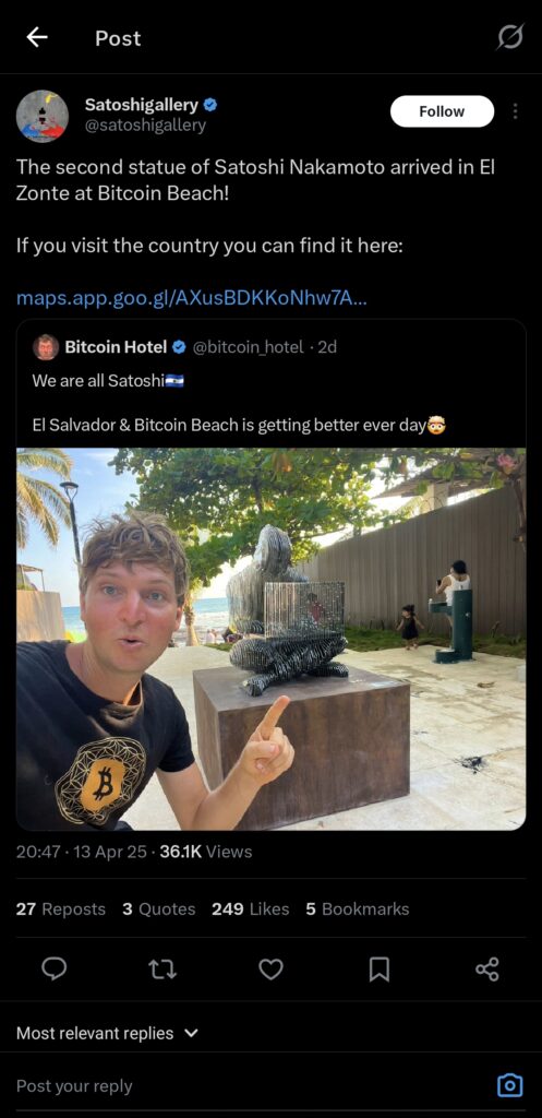 جدیدترین مجسمه در ال زونته (El Zonte) واقع در کشور السالوادور نصب شده است؛ منطقهای که با نام ساحل بیت کوین (Bitcoin Beach) شناخته میشود و محبوبیت زیادی در میان علاقهمندان BTC دارد. رونمایی از این مجسمه همزمان با امضای توافقنامهای توسط دولت السالوادور برای تقویت قوانین حوزه ارزهای دیجیتال انجام شده است.