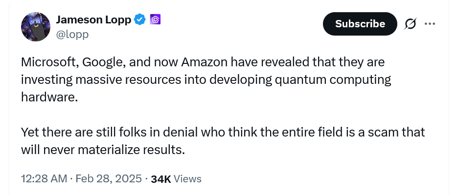 این شرکت معتقد است سامانهای با ۲٬۰۰۰ کیوبیت لاجیکال (تصحیح شده با خطا) برای شکستن یک کلید ECC 256 بیتی کافی است. جیمسون لاپ (Jameson Lopp)، یکی از سایفرپانکهای بیت کوین، اخیراً گفت جواب داده به این سوال که تا چه حد باید نگران تهدید کوانتومی بود، در حال حاضر «غیرقابل پاسخ» است.