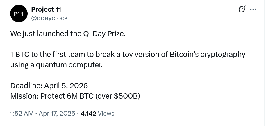 به گزارش میهن بلاکچین، در تاریخ ۲۷ فروردین (۱۶ آوریل)، این شرکت اعلام کرد که به هر کسی که بتواند با استفاده از رایانه کوانتومی، بزرگترین بخش از یک کلید بیت کوین را در مدت یک سال بشکند، ۱ بیت کوین جایزه میدهد.