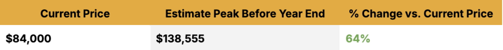 اگرچه هنوز امکان اصلاح قیمت وجود دارد که ممکن است تا میانگین متحرک ۲۰۰ روزه در محدوده ۷۷٬۰۰۰ دلار ادامه یابد، اما ساختار کلی بازار حاکی از روند صعودی ادامهدار است. پیشبینی قیمت ۱۳۸٬۵۵۵ دلار معادل یک رشد ٪۶۴ نسبت به سطوح فعلی خواهد بود.