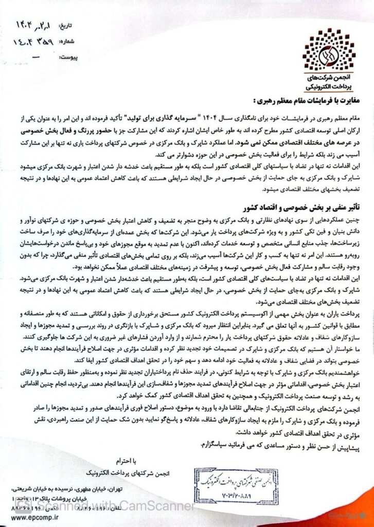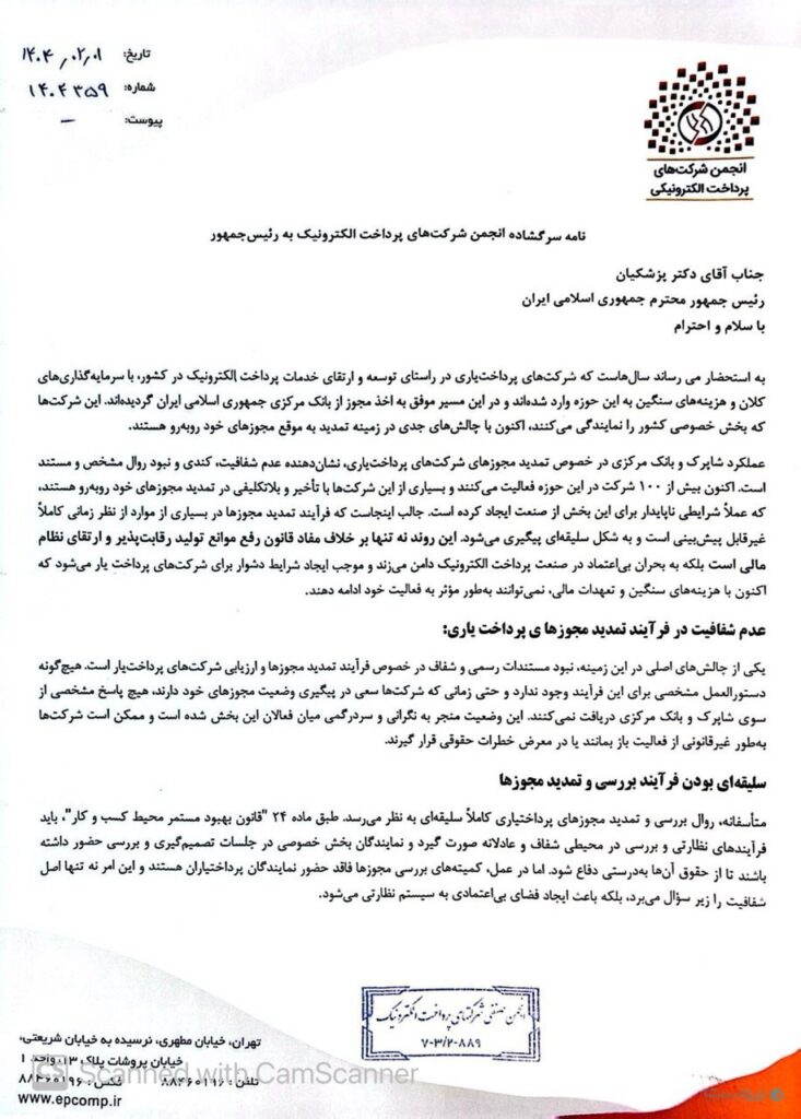 نامه انجمن پرداخت الکترونیک خطاب به رییسجمهور – صفحه ۲