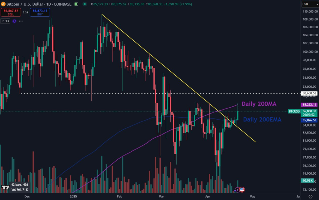 میانگین متحرک ۲۰۰ روزه، بهطور سنتی در بازارهای صعودی بیت کوین به عنوان حمایت عمل میکند؛ اما این سطح در ماه مارس و همزمان با فشار فروش ناشی از آغاز جنگ تجاری آمریکا به پایین شکسته شد.