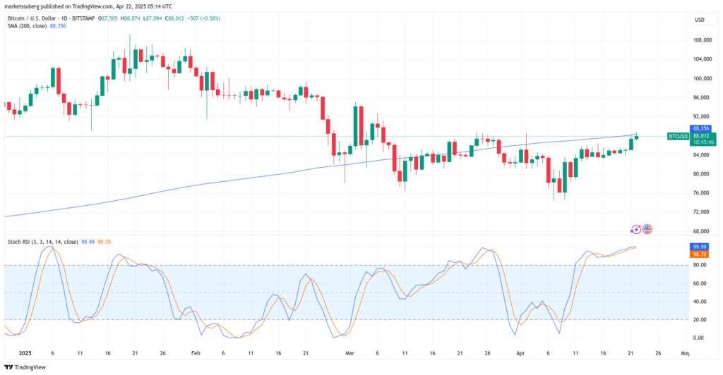 در تاریخ ۲۲ آوریل (۲ اردیبهشت)، شاخص Stochastic RSI روزانه در بالاترین نقطه مقیاس خود یعنی سطح ۱۰۰ قرار داشت.