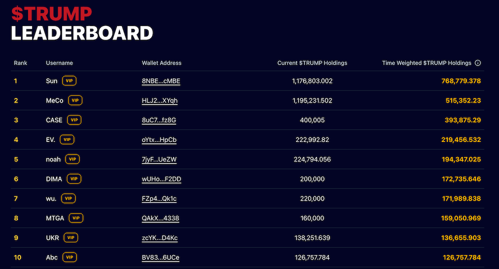 تا تاریخ ۲۵ آوریل (۵ اردیبهشت)، بزرگترین هولدر توکن، ۱,۱۷۶,۸۰۳ میمکوین TRUMP به ارزش تقریبی ۱۶ میلیون دلار در داشت. هولدر این کیف پول، با نام کاربری «سان» (Sun)، باعث گمانهزنیهایی شده است مبنی بر اینکه جاستین سان، بنیانگذار ترون (Tron) که از حامیان ترامپ و سرمایهگذار در شرکت رمزارزی ورلد لیبرتی فایننشال (World Liberty Financial) با حمایت خانواده ترامپ بوده، ممکن است جزو شرکتکنندگان در مراسم شام باشد.