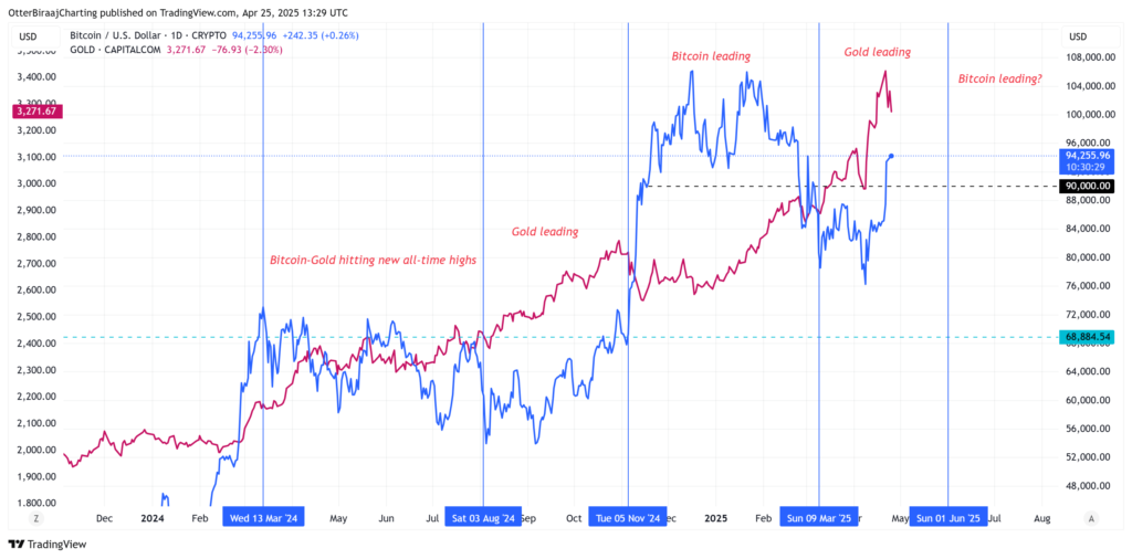 هم بیت کوین و هم طلا، بین ماههای مارچ و آگوست سال ۲۰۲۴ به اوجهای جدیدی دست یافتند. با این حال، طلا در سهماهه سوم سال ۲۰۲۴ در رشد پیشی گرفته و عملکرد بهتری در مقایسه با بیت کوین داشت. در سهماهه چهارم، بیت کوین دوباره شتاب گرفته و سبقت خود از طلا را تا مارچ سال ۲۰۲۵ حفظ کرد؛ سپس طلا دوباره برتری را بهدست آورد.