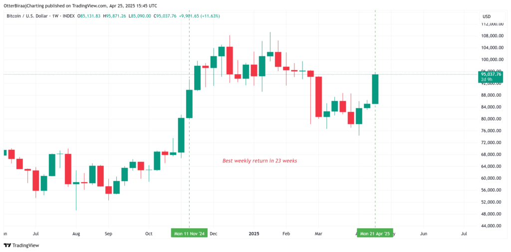 در هفته جاری، قیمت بیت کوین ۱۱٪ افزایش یافته که بهترین بازده هفتگی در سال ۲۰۲۵ و بالاترین رشد هفت روزه آن از اوایل نوامبر ۲۰۲۴ تاکنون بوده است. قیمت BTC در تاریخ ۲۵ آپریل (۵ اردیبهشت) برای نخستین بار از ۲۴ فوریه (۶ اسفند)، به سطح ۹۵,۰۰۰ دلار رسید.