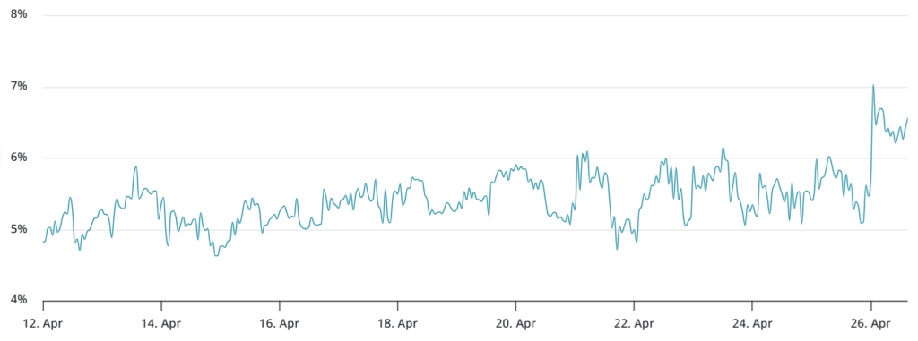 در تاریخ ۲۶ آوریل (۶ اردیبهشت)، پریمیوم (Premium) قراردادهای آتی دوماهه بیت کوین (Basis Rate) به بالاترین سطح در هفت هفته گذشته رسید و به ۶.۵٪ افزایش یافت. این رقم همچنان در محدوده خنثی ۵٪ تا ۱۰٪ قرار دارد، اما از ناحیه نزولی فاصله گرفته است.