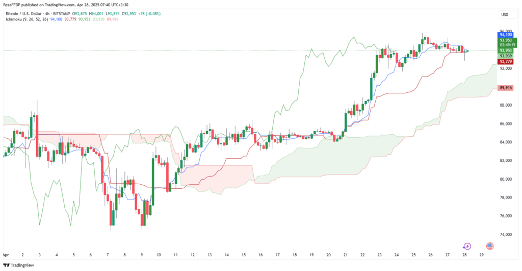 در نمودار ۴ ساعته بیت کوین مشاهده میشود که قیمت در محدوده ۹۳٬۹۰۰ تا ۹۴٬۰۰۰ دلار نوسان میکند و به نظر میرسد در حال تلاش برای تثبیت بالای ابر ایچیموکو است. تنکانسن (خط آبی) و کیجونسن (خط قرمز) در نزدیکی یکدیگر قرار گرفتهاند که نشاندهنده کاهش مومنتوم صعودی در کوتاهمدت است. همچنین قیمت در حال حاضر کمی پایینتر از تنکانسن قرار دارد که میتواند نشانهای از ضعف موقت خریداران باشد.
