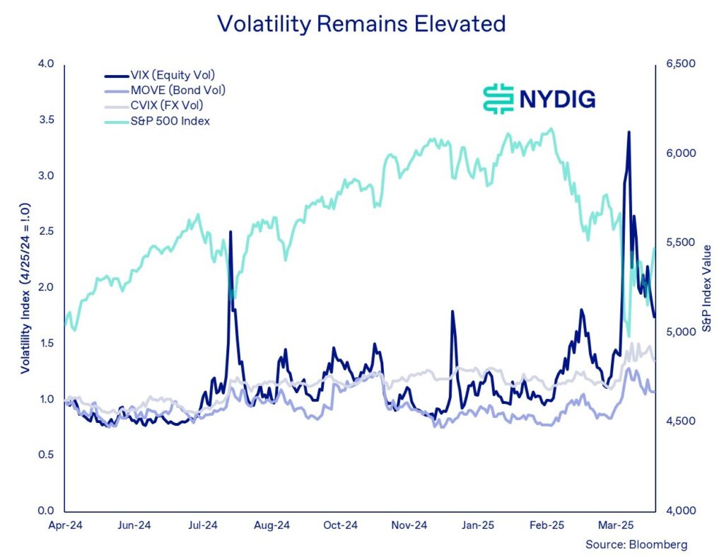 در میان نوسانات شدید در بازار سهام (که با شاخص VIX سنجیده میشود)، نرخهای ارز (با شاخص CVIX) و نرخهای بهره و اوراق قرضه (با شاخص MOVE)، سرمایهگذاران بهدنبال داراییهای پناهگاه امن بودهاند.