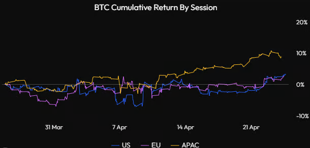 دادههای اخیر نشان میدهد منطقه آسیا-اقیانوسیه/چین نقش اصلی را در حرکت صعودی اخیر ایفا کرده است، اگرچه در روز سهشنبه شاهد ورود قابل توجه سرمایه به ETFهای بیت کوین نیز بودیم که در نمودار زیر لحاظ نشده است. این یک علامت مثبت است، اما معتقدیم که بدون مشارکت قوی بازار ایالات متحده، احیای ساختار بازار صعودی برای بیت کوین دشوار خواهد بود.