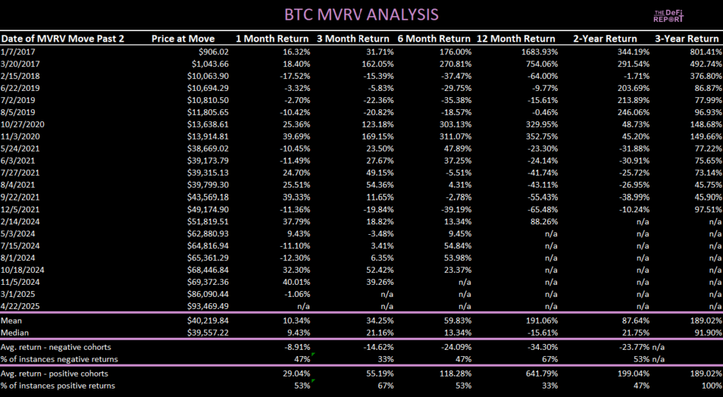 بهطور کلی، خرید پس از عبور شاخص MVRV-Z از سطح ۲ در یک روند صعودی میتواند منجر به بازده قوی شود، اما این نتایج بهطور تاریخی در ابتدای چرخههای صعودی (اوایل ۲۰۱۷، اواخر ۲۰۲۰) رخ داده است.