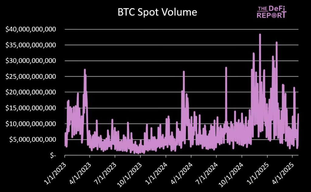 حجم معاملات روزانه بیت کوین در ماه آوریل بهطور متوسط در سطح ۸.۷ میلیارد دلار قرار داشته است که مشابه سطوح ابتدای رالی صعودی سال ۲۰۲۳ محسوب میشود. در جریان صعود اخیر در روز سهشنبه، حجم معاملات به ۱۳ میلیارد دلار رسید، اما این رقم همچنان کمتر از نیمی از حجم معاملاتی است که معمولاً در روزهای با نوسانات شدید شاهد آن هستیم.