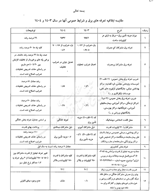 بر این اساس تعرفه برق مشترکان تحت پوشش کمیته امداد امام خمینی (ره) و سایر نهادهای حمایتی برابر صفر محاسبه میشود. تعرفههای جدید طبق جدول زیر خواهد بود: