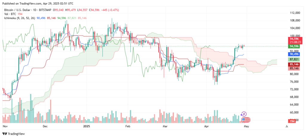 با این حال، بیت کوین طی چند روز گذشته در محدودهای نسبتاً فشرده بین ۹۴٬۵۰۰ دلار و ۹۵٬۵۰۰ دلار نوسان کرده است. این تثبیت قیمت میتواند نشانهای از تشکیل انرژی جدید برای حرکت بعدی باشد. شکست مقاومتی در حوالی ۹۵٬۵۰۰ دلار میتواند زمینهساز رشد به سمت اهداف بالاتر مثل ۹۸٬۰۰۰ دلار یا حتی ۱۰۰٬۰۰۰ دلار باشد. در مقابل، در صورت از دست رفتن حمایت ۹۲٬۰۰۰ دلار (ناحیه حمایت کوتاهمدت) احتمال اصلاح قیمتی به سمت سطح کلیدی ۹۰٬۴۹۶ دلار و سپس ۸۷٬۸۲۱ دلار (لبه بالایی ابر کومو) وجود خواهد داشت.