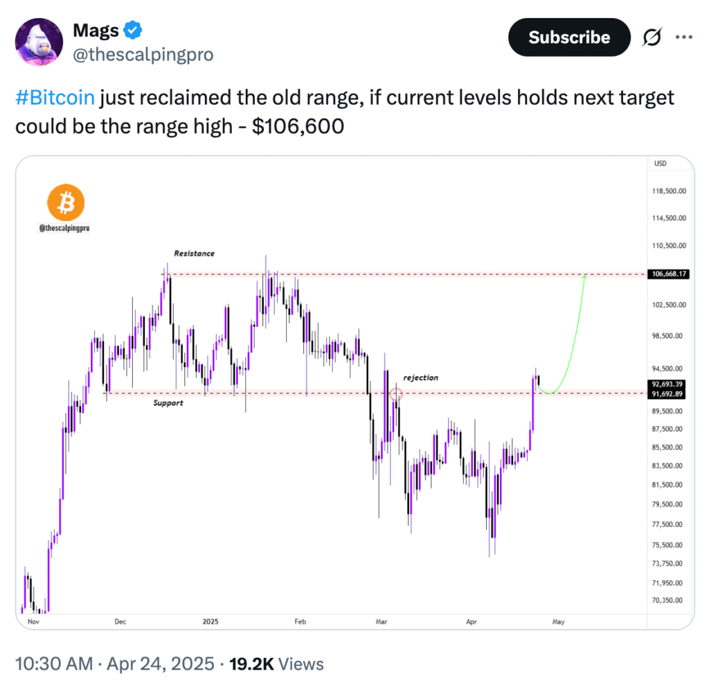 در پستی که در تاریخ ۲۴ آوریل (۴ اردیبهشت) در شبکه اجتماعی X منتشر شد، مگز (Mags) معاملهگر محبوب بر اهمیت محدوده قیمتی فعلی تأکید کرد و گفت که اگر این محدوده حفظ شود، میتواند هدف بعدی ۱۰۶٬۰۰۰ دلار را دنبال کند.