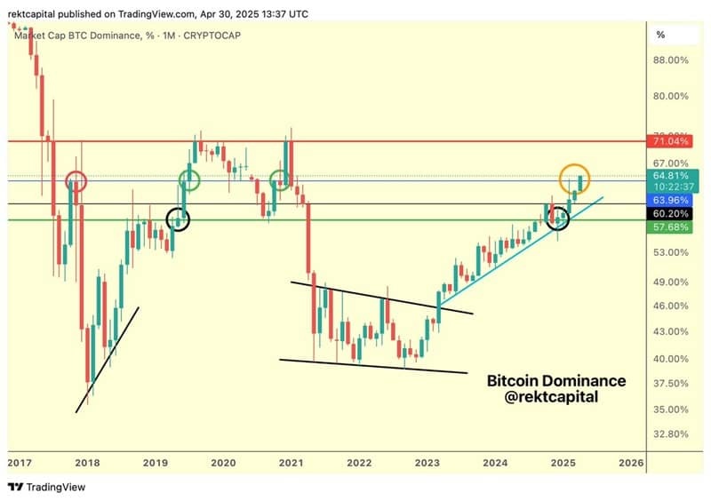 به گفته رکت کپیتال، اگر تاریخ تکرار شود، آلت سیزن واقعی که همه منتظر آن هستند، زمانی آغاز میشود که دامیننس بیتکوین به نزدیک ۷۱٪ (دایره قرمز) برسد یا مستقیما از آن ریجکت شود.