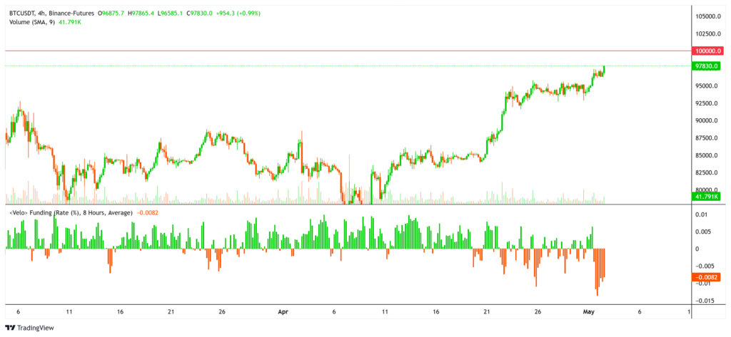 در حالی که روند صعودی بیت کوین ادامه دارد، نمودارهای بازه زمانی کوتاه (LTF) تغییراتی در رفتار بازار نشان میدهند. فاندینگ ریت (Funding Rate) معاملات آتی بیت کوین دوباره منفی شده که نشاندهنده افزایش موقعیتهای فروش (Short) است. این یعنی بسیاری از معاملهگران امید در کاهش قیمت بیت کوین دارند.