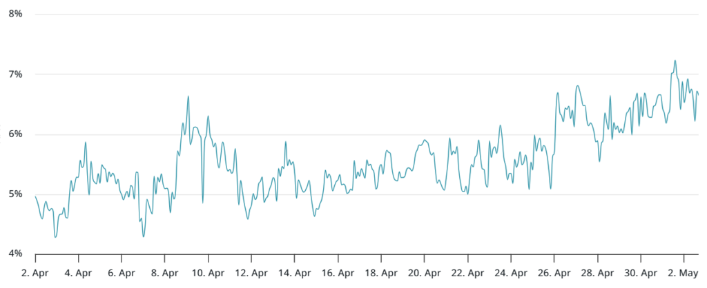 پرمیوم سالانه قراردادهای فیوچرز دوماهه بیت کوین طی هفته گذشته بین ۶٪ تا ۷٪ باقی مانده که در محدوده «خنثی» (۵٪ تا ۱۰٪) محسوب میشود. این در حالی است که در ژانویه، بیت کوین در نزدیکی ۹۵٬۰۰۰ دلار معامله میشد اما پرمیوم بیش از ۱۰٪ بود. این کاهش پرمیوم، بیانگر افت اطمینان معاملهگران نسبت به رشدهای قیمتی شدید است.