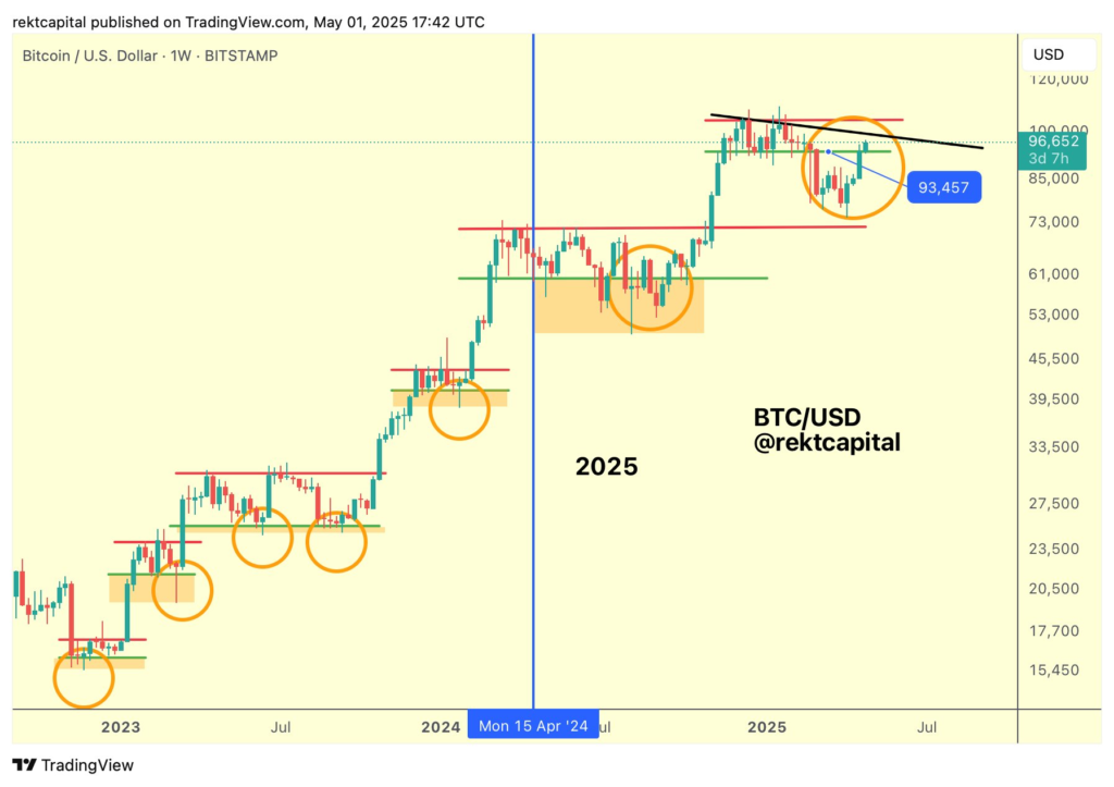 از سوی دیگر، کینگ فیشر (TheKingfisher) با استناد به دادههای نقدینگی سفارشها در صرافیها، احتمال افت کوتاهمدت به ۹۵ هزار دلار را مطرح کرد. در مقابل، تحلیلگر مشهور، رکت کپیتال (Rekt Capital) سطح ۹۹ هزار دلار را بهعنوان هدف قیمتی مهم برای پایان هفته معرفی کرد و گفت: