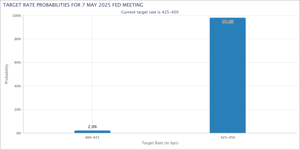 در حال حاضر بازارها تنها ۲٪ احتمال برای کاهش نرخ بهره در جلسه بعدی فدرال رزرو در تاریخ ۷ می (۱۷ اردیبهشت) قائل هستند.