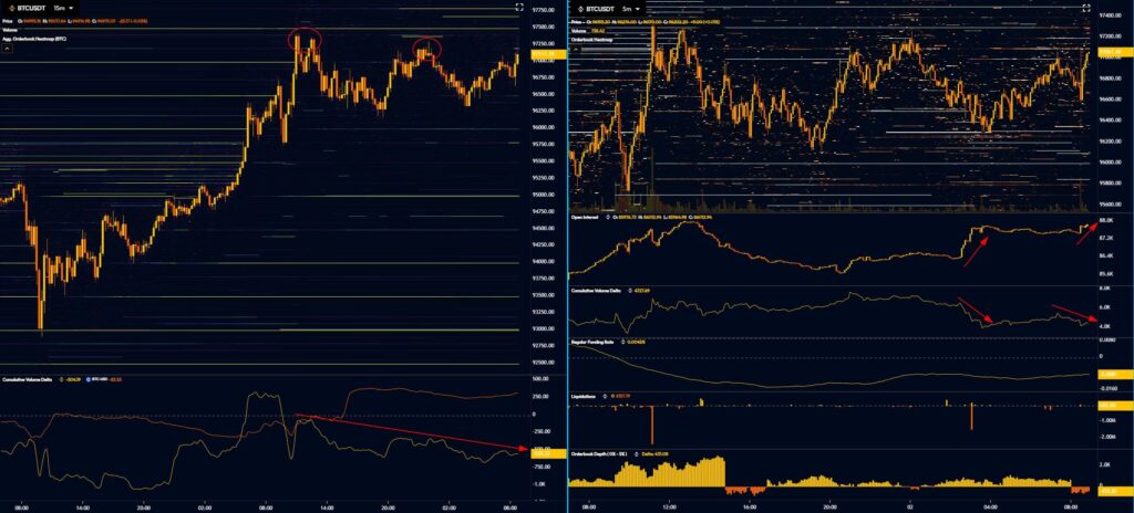 فروشندگان در سطح ۹۷٬۲۰۰ دلار مقاومت نشان دادهاند و پوزیشنهای شورت در حال افزایش هستند. جریانهای اسپات غیرفعال احتمالاً بار دیگر روند را مشخص میکنند.