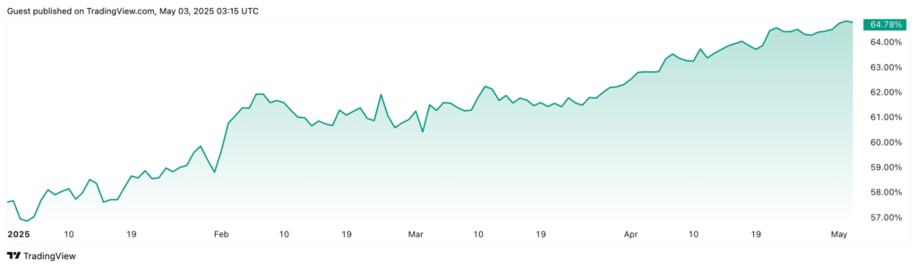در حال حاضر، طبق دادهها دامیننس بیت کوین یعنی نسبت ارزش بازار بیت کوین به کل بازار رمزارز، به ۶۴.۷۸٪ رسیده است.