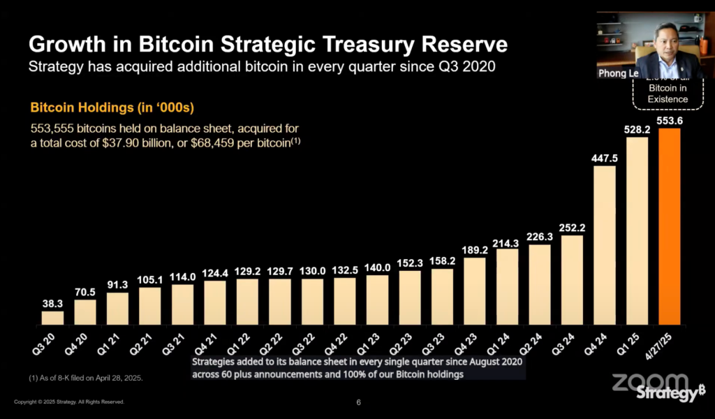بر اساس دادهها، آخرین خرید شرکت در تاریخ ۲۸ آوریل (۸ اردیبهشت) انجام شده که طی آن ۱۵٬۳۵۵ بیت کوین به ارزش بیش از ۱.۴ میلیارد دلار خریداری شده و مجموع داراییهای بیت کوینی شرکت را به ۵۵۳٬۵۵۵ بیت کوین رسانده است.