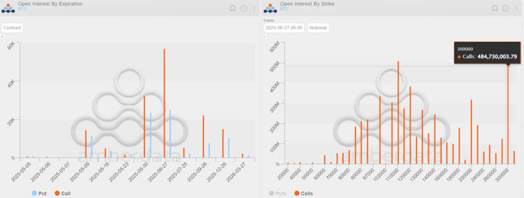 نمودارها نشان میدهند سررسید ۲۶ ژوئن بزرگترین تاریخ تسویه در میان تمامی سررسیدهای امسال است و آپشن ۳۰۰٬۰۰۰ دلاری دومین موقعیت از نظر سود باز (Open Interest) بالا در این دوره را دارد.