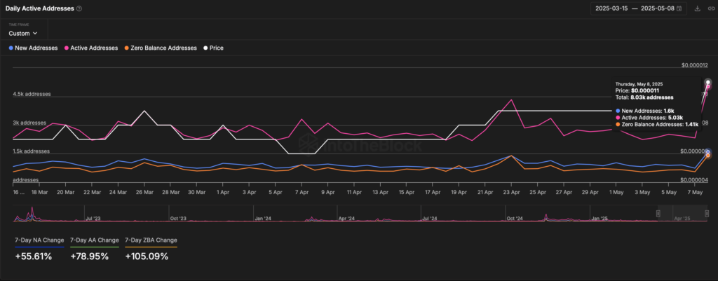 با افزایش محبوبیت دوباره PEPE، سرمایهگذاران قدیمی و جدید به این میم کوین بازگشتهاند. طبق دادههای اینتو د بلاک (IntoTheBlock)، تعداد آدرسهای فعال پپه بیش از ۱۰۰٪ افزایش یافته و در طول ۲۴ ساعت گذشته، به ۵,۰۳۰ آدرس رسیده است که ۱,۶۰۰ آن آدرسهای جدیدی هستند. در ۷ روز گذشته، آدرسهای فعال ۷۸٪ و آدرسهای جدید ۵۵٪ افزایش یافتهاند. این آمار نشاندهنده مشارکت گسترده کاربران خرد و افزایش فعالیت شبکه است.