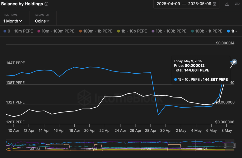 افزایش حمایت نهنگها یکی از عوامل اصلی رشد اخیر پپه محسوب میشود. طبق دادههای اینتو د بلاک، گروه نهنگهایی که بین ۱ تا ۱۰ تریلیون توکن پپه در اختیار دارند، در طول ۴۸ ساعت گذشته بیش از ۱۰ تریلیون توکن به دارایی خود افزودند. در حال حاضر، این گروه ۱۴۴.۸۶ تریلیون توکن PEPE در اختیار دارد.