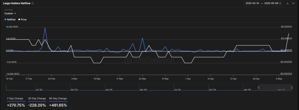 هولدرهای بزرگ نیز از اواسط آپریل اعتماد خود به پپه را با خالص جریان مثبت دارایی نشان دادهاند. در تاریخ ۸ می، خالص جریان دارایی این گروه به ۹۳۲.۵۸ میلیارد توکن رسید، که نشانهای از افزایش تقاضا برای پپه از سوی سرمایهگذاران بزرگ است.