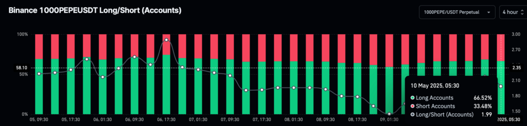 در میان فضای خوشبینی موجود در بازار کریپتو، معاملهگران بایننس دیدگاه بسیار مثبتی نسبت به پپه دارند. طبق دادههای کوین گلس (CoinGlass)، بیش از ۶۶٪ از تریدرها پوزیشن لانگ روی این میم کوین دارند و نسبت لانگ به شورت تقریباً به عدد ۲ رسیده است. این حمایت سنگین از سوی تریدرهای بایننس، میتواند بهعنوان سوختی اهرمی برای ادامه رشد قیمت پپه عمل کند.