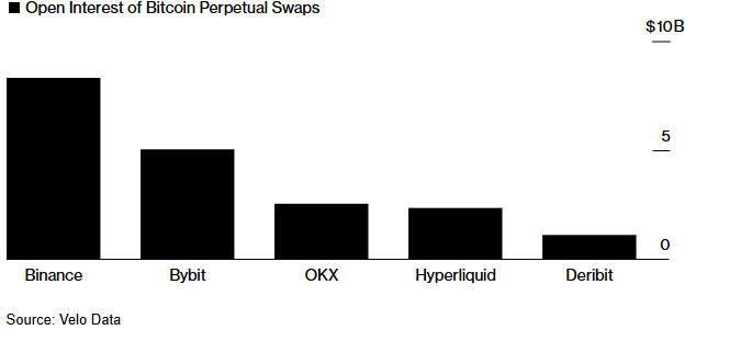 این موضوع را میتوان از آخرین دادههای مربوط به سود باز (Open Interest) در محصولات محبوب فیوچرز بیت کوین در میان برترین پلتفرمهای معاملاتی مشاهده کرد. طبق دادههای «ولو دیتا» (Velo Data)، هایپرلیکوئید (Hyperliquid)، به یکی از برترین پلتفرمهای معاملاتی برای قراردادهای دائمی بیت کوین تبدیل شده است. این موفقیتی بیسابقه برای یک صرافی غیرمتمرکز در بازاری است که بهطور تاریخی تحت سلطه بازیگران متمرکزی مانند صرافی غولآسای بایننس قرار داشته است.