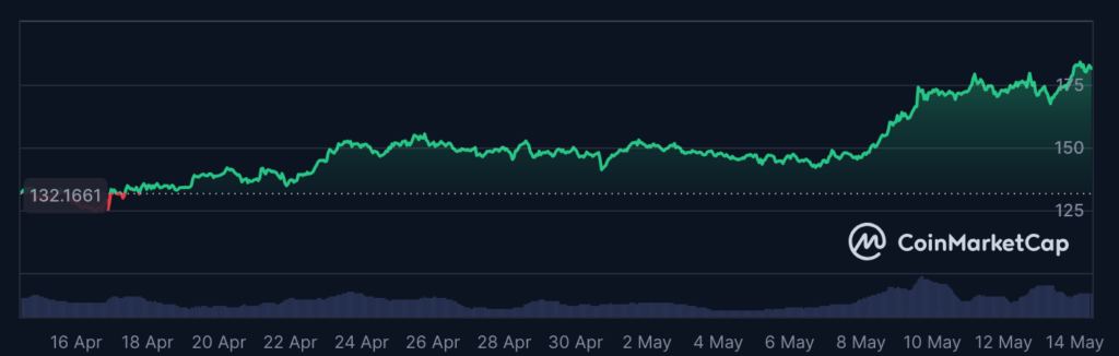 قیمت سولانا در طول ۳۰ روز گذشته ۳۸.۳۲٪، در سال گذشته ۲۴.۵۹٪ افزایش یافته و در زمان نگارش این مطلب به ۱۸۲.۳۳ دلار رسیده است.