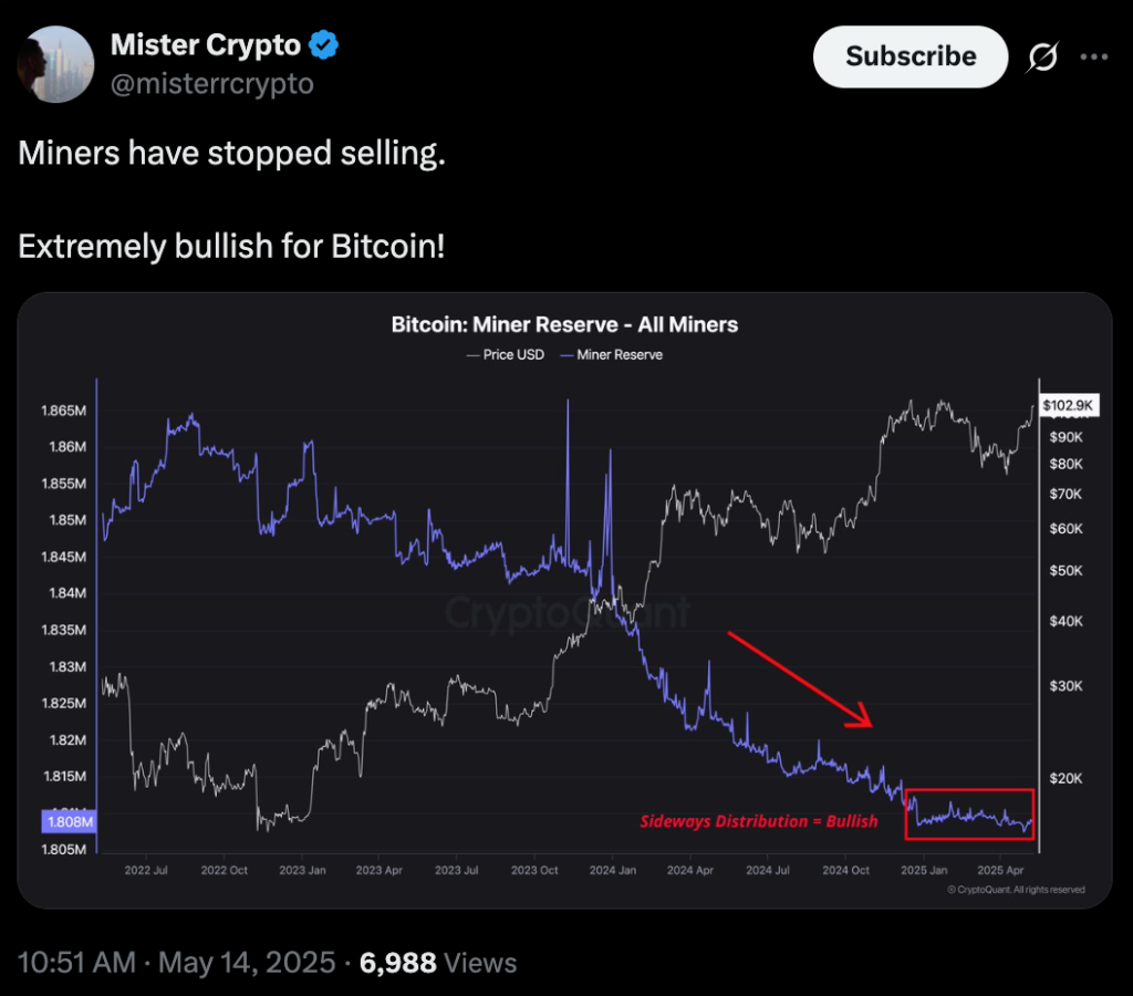 ماینرها دست از فروش برداشتهاند – منبع: حساب Mister Crypto در X