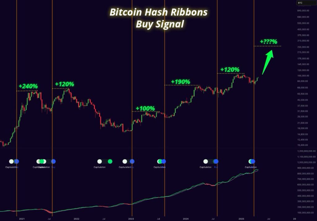 شاخص هش ریبونز که توسط شرکت سرمایهگذاری کوانت کاپریول (Capriole) ساخته شده، از دو میانگین متحرک هشریت برای شناسایی دورههای تسلیم (Capitulation) در میان ماینرها استفاده میکند. این شاخص در اواخر ماه مارچ، سیگنال ورود به بازار را صادر کرد. از آن زمان تاکنون، قیمت BTC حدوداً ۲۰٪ افزایش یافته است.
